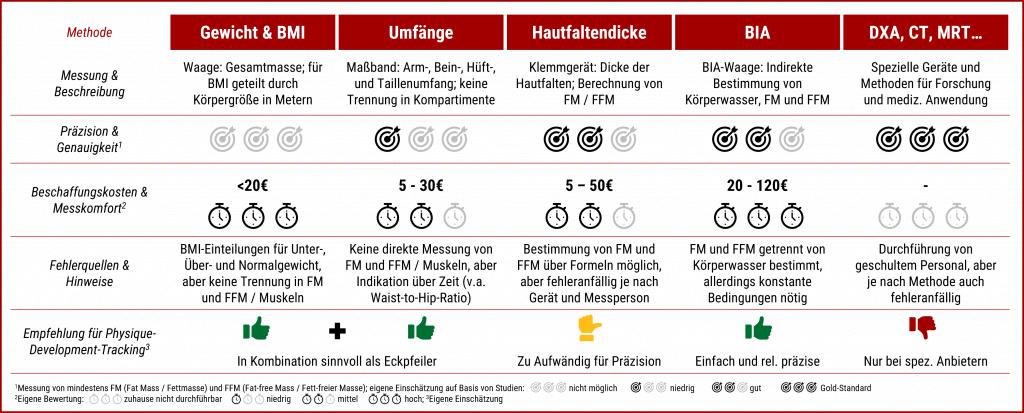 Grundsätzlich sollten für Messungen der Body Composition – vor allem für möglichst genaue Bestimmungen bzw. Hinweise auf Veränderungen des Speicherfetts und der Muskelmasse – mehrere Methoden kombiniert werden. Wenn man mehrere Werte mit einbezieht, hat man ein ziemlich sicheres Tracking-Tool als Bewertungsgrundlage für die Physique Development.