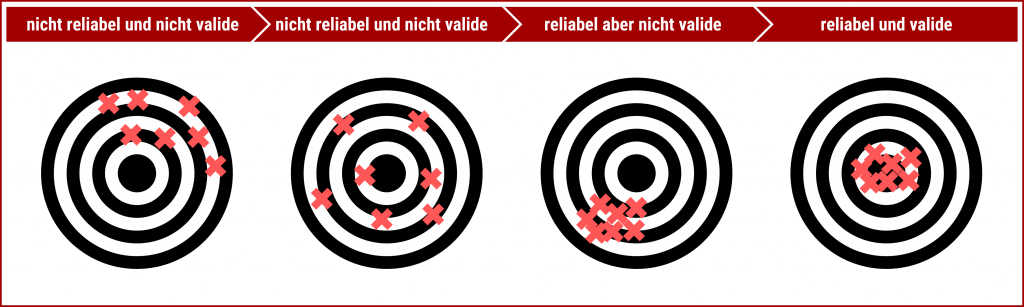 Die Grafik veranschaulicht nochmals die Konzepte der Reliabilität und Validität. Man könnte zwar sagen, dass bei niedriger Reliabilität eine Messung trotzdem valide sein kann, wenn die gemessenen Werte alle um den Wert streuen, der in Wahrheit existiert (siehe zweites Bild von links). Da wir aus einer einzelnen Messung dann aber nur mit viel Glück den wahren Wert erfahren, setzt eine valide Messung allgemein Reliabilität voraus.